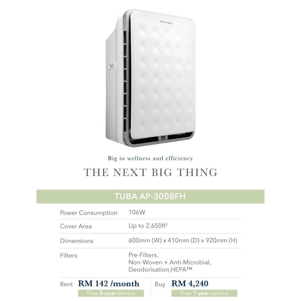Ia membuang kebimbangan . Penapis Udara (Air Purifier) mampu . Coway Air Purifier Tuba. Tiada lagi batuk dan menutup hidung sebab bau, habuk, bulu kucing dan asap rokok. MÁY LỌC KHÔNG KHÍ COWAY. Máy lọc không khí công suất cao loại bỏ những lo ngại. TUBA merupakan pembersih udara yang terbesar, dilengkapi dengan teknologi terkini dan paling maju.